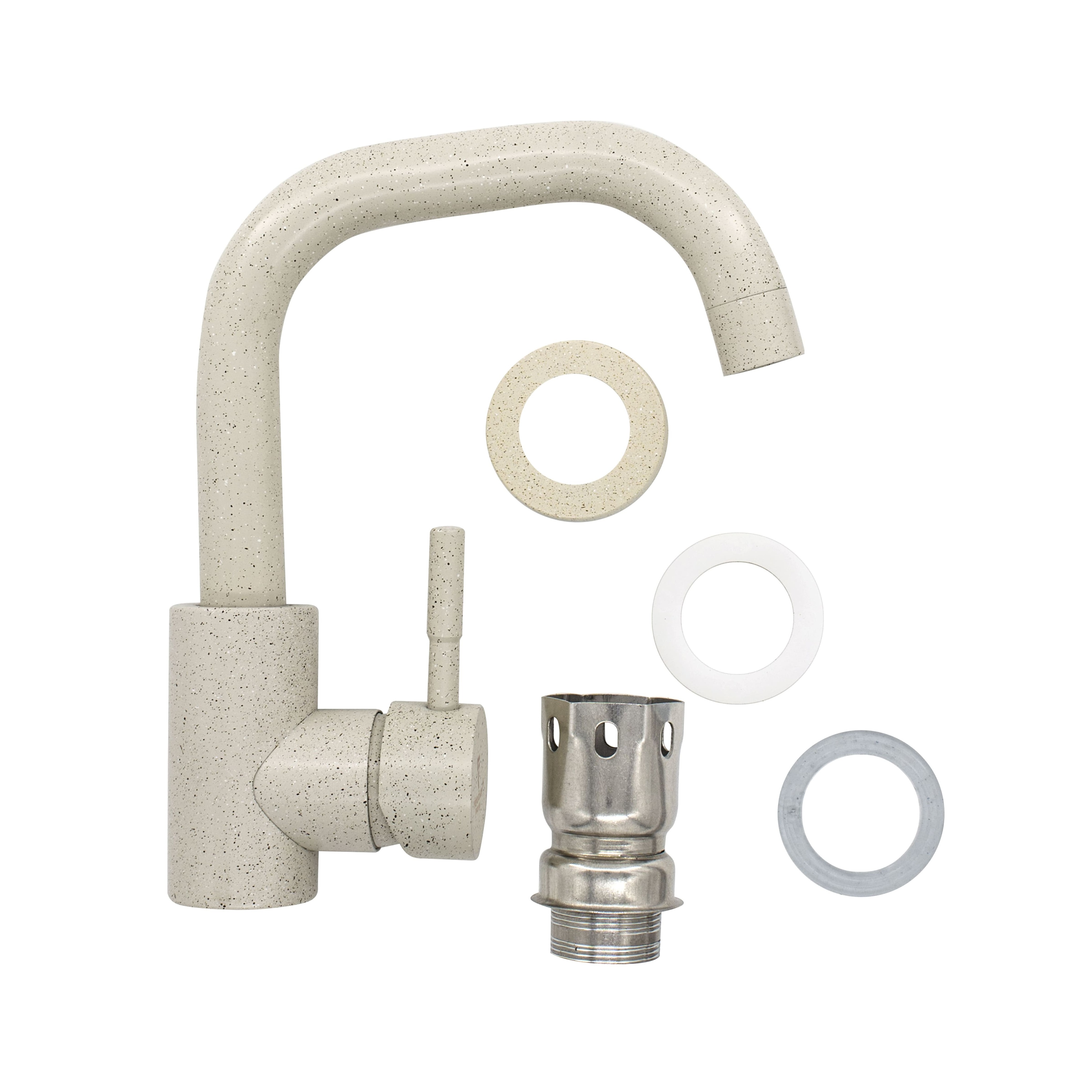 Смеситель позволяет регулировать поток воды и получать воду требуемой температуры при смешивании горячей и холодной воды, изготовлен из нержавеющей стали. Смеситель однорычажный для кухни. Крепление гайка, картридж 40 мм. Размер: 165x135x225мм. Вес: 1250г. Длина излива: 15 см. Высота излива: 17 см. Цвет: бежевый с точками. Гарантия на корпус: 3 года. Страна производства: Китай.
